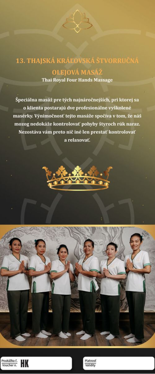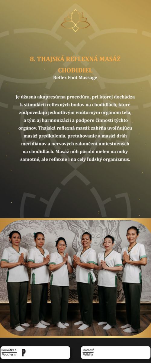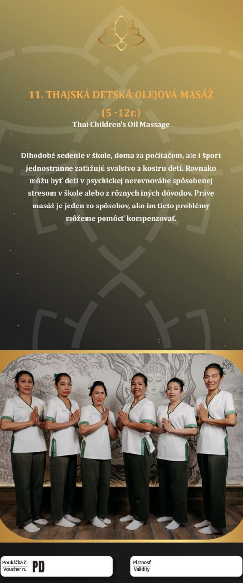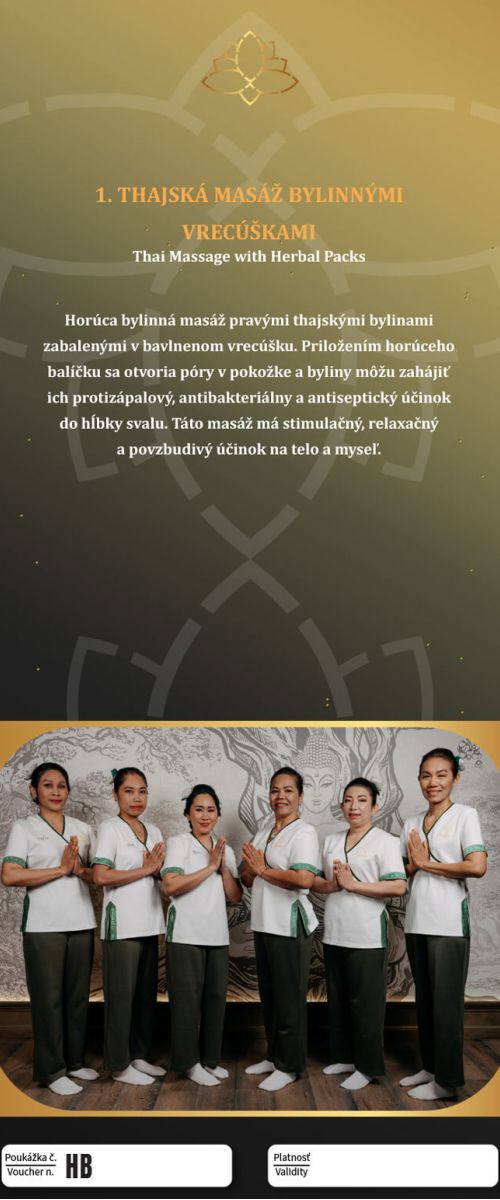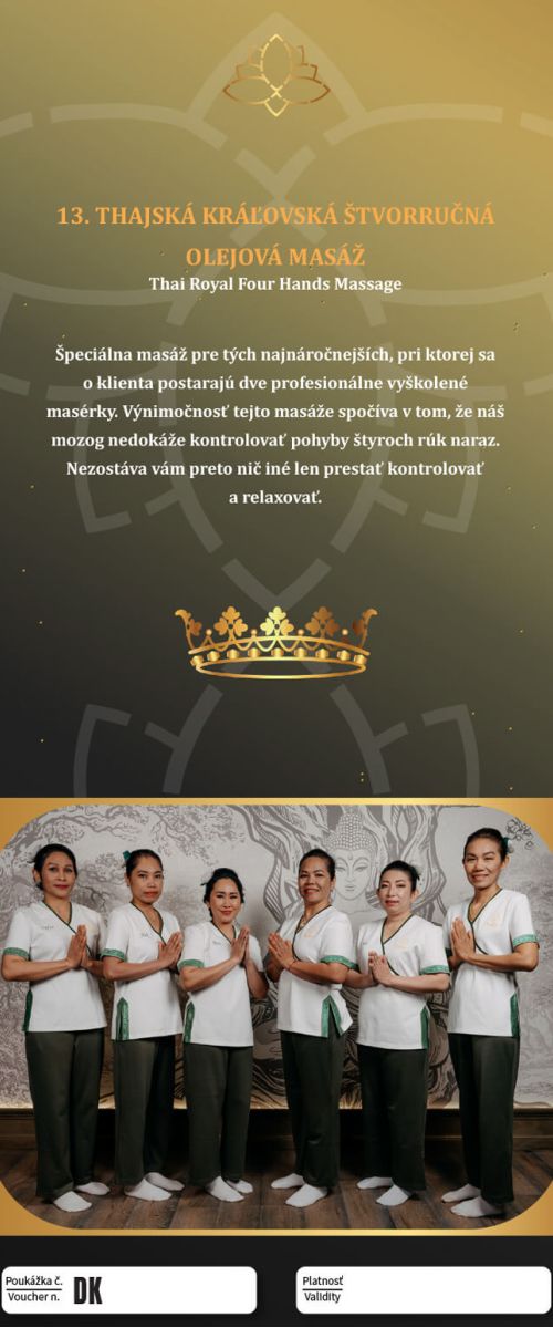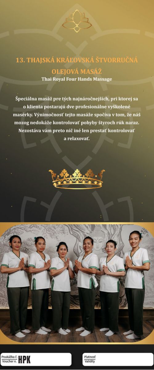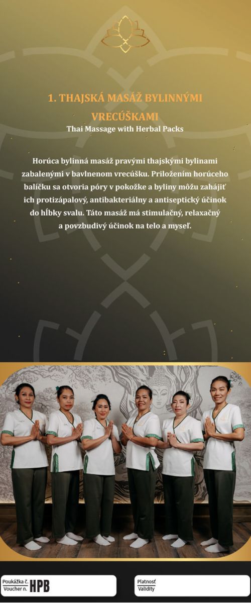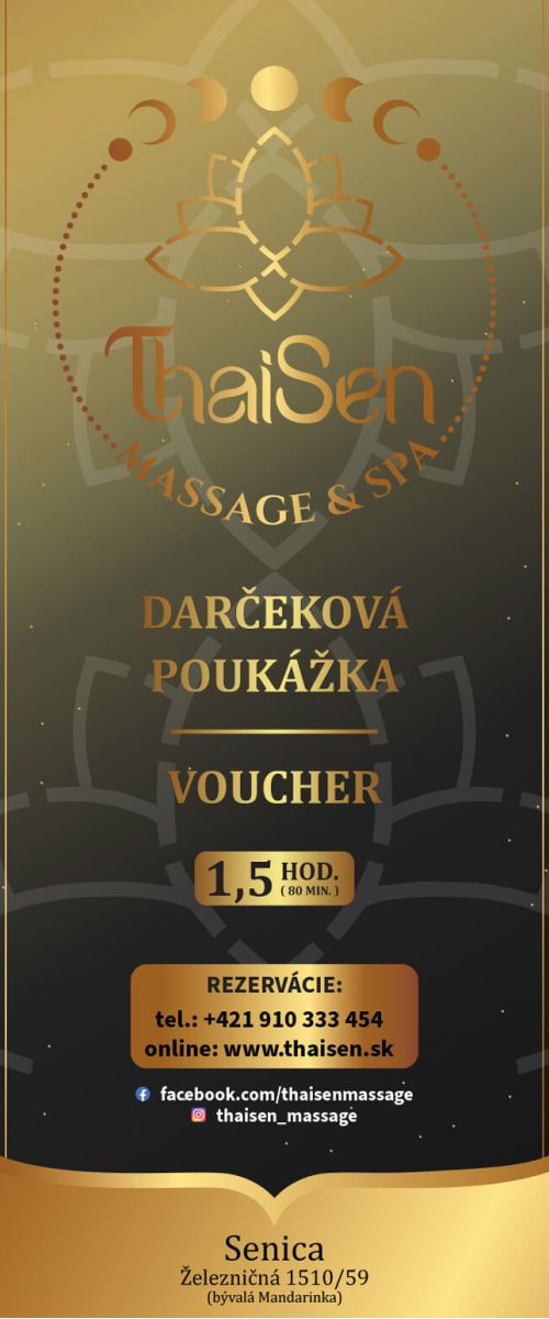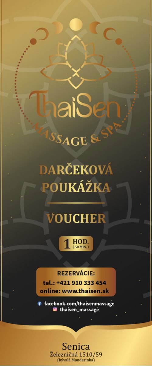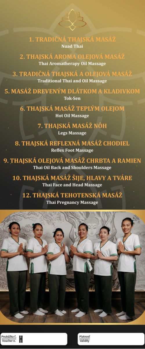 Potešte svojho blízkeho darčekovou poukážkou na pravú thajskú masáž. V ponuke máme poukážky v luxusnom prevedení na všetky typy masáží.