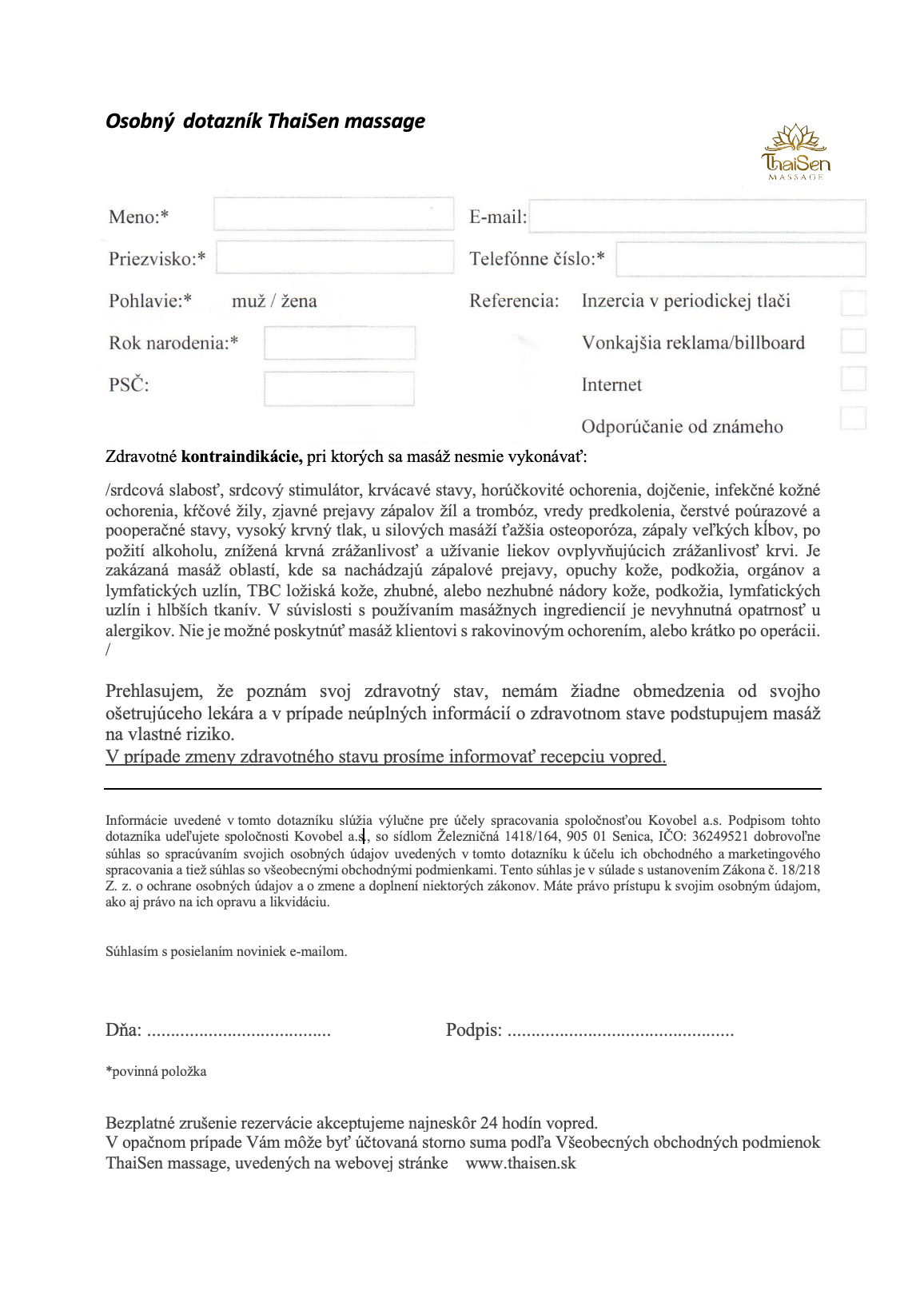 Ak nás navštevujete po prvýkrát, požiadame vás vyplniť osobný dotazník. Ten si môžete vytlačiť a vyplniť doma, alebo ho dostanete priamo na recepcii pred masážou.